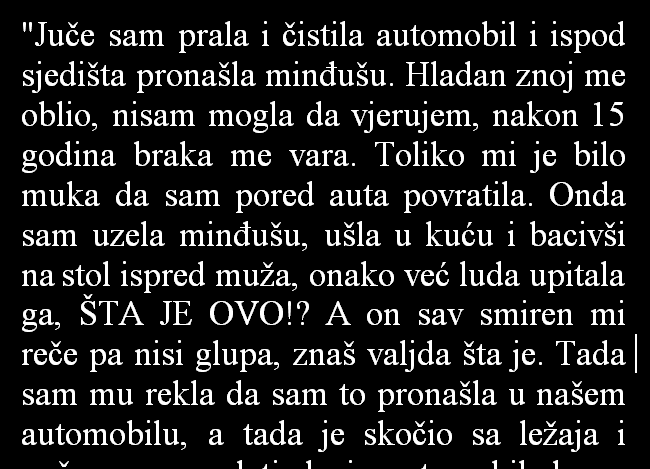“Juče sam prala i čistila automobil i ispod sjedišta pronašla minđušu. Hladan znoj me oblio, nisam mogla da vjerujem, nakon 15 godina braka me vara. Toliko mi je bilo muka da sam pored auta povratila.