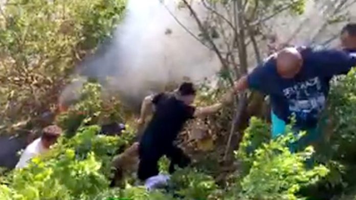 Prolaznici i hitne službe žurili su kako bi spasili čovjeka koji je bio zarobljen u svom gorućem automobilu nakon što je skrenuo s puta i sletio niz nasip.