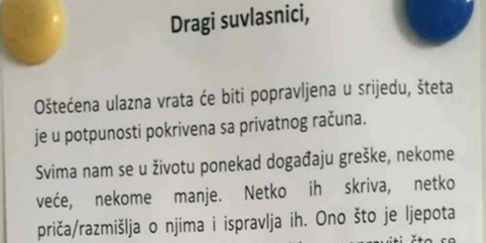 Netko je oštetio ulazna vrata stambene zgrade, PORUKA koja je osvanula na ulazu vraća vjeru u ljude