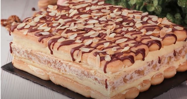 Sastojci: 200 g piškota, 550 ml mleka, 5 jaja, 435 g šećera, 300 g putera, 40 g pudinga od vanile, 1 kesica vanilin
