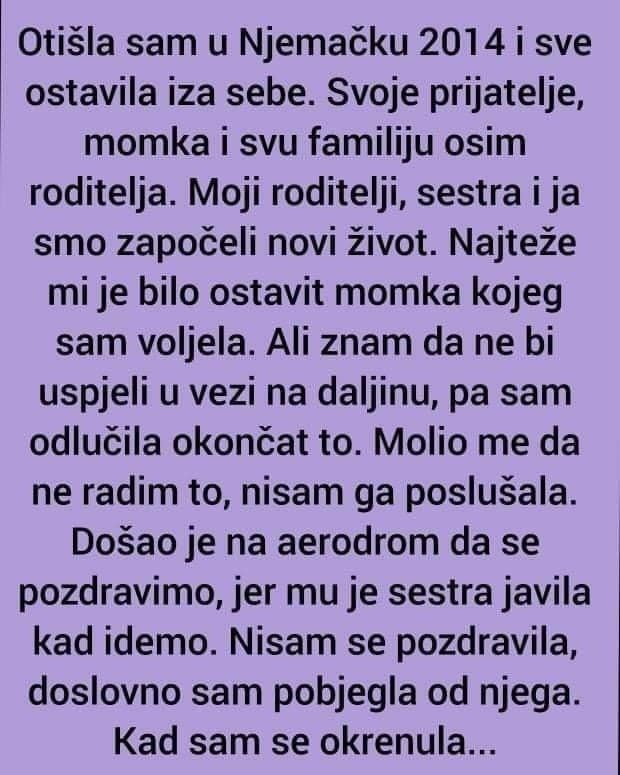 “Otišla sam u Njemačku 2014 i sve ostavila iza sebe. Svoje prijatelje, momka i svu familiju osim roditelja. Moji roditelji, sestra i ja smo započeli novi život. Najteže mi je bilo ostavit momka kojeg sam voljela. Ali znam da ne bi uspjeli u vezi na daljinu, pa sam odlučila okončat to.