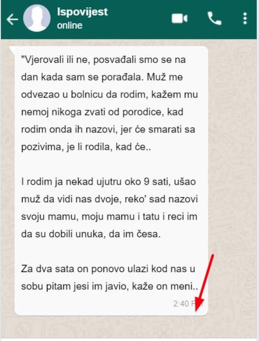 Za dva sata on ponovo ulazi kod nas u sobu pitam jesi im javio, kaže on meni ja nazvao svoje rekao sam da nazovu i tvoje, nek jave. Kad nisam tada pukla, nije bio u stanju moje roditelje da nazove kao zet. Reko’ okej, sad ću ja na Viber nazvati moju mamu da vidi bebu, a tvoja mama ce bebu vidjeti kad izađemo iz bolnice. Naljutio se na mene, nije htio pričati sa mnom cijeli dan, a rodila mu sina. “