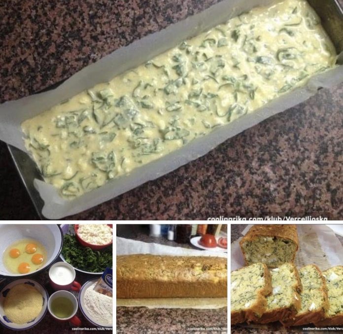1.Umutimo jaja sa pola kasicice soli, da postanu pjenasta. Dodamo ulje i jos mutimo. Zatim dodamo jogurt, promesamo pa dodamo brasno, palentu, pecivo i mesamo da se masa ujednaci. Na kraju dodamo spanac prethodno opran i naseckan na trakice i izmrvljeni sir na krupno, da se vise poznaje.