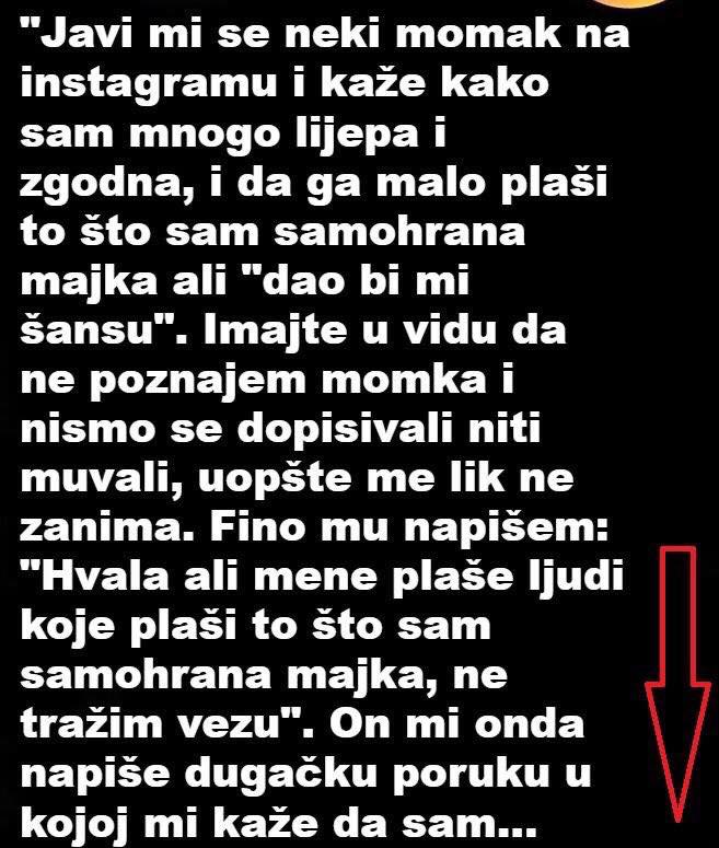 Javi mi se neki momak na instagramu i kaže kako sam mnogo lijepa i zgodna, i da ga malo plaši to što sam samohrana majka ali “dao bi mi šansu”. Imajte u vidu da ne poznajem momka i nismo se dopisivali niti muvali, uopšte me lik ne zanima.