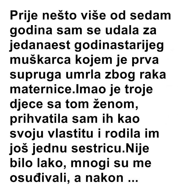 Prije nešto više od sedam godina sam se udala za jedanaest godina starijeg muškarca kojem je prva supruga umrla zbog raka maternice. Imao je troje djece sa tom ženom, prihvatila sam ih kao svoju vlastitu i rodila im još jednu sestricu.Nije bilo lako, mnogi su me osuđivali, a nakon svega sinoć mi je najstarija suprugova kći rekla: