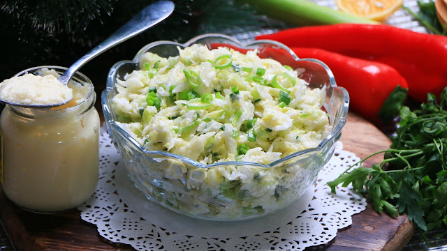 Kupus izrendati posoliti sa pola kašičice soli i ostaviti da pusti vodu pa ocediti. Izmešati sa ostalim sastojcima, luk iseckajte sve za zelenim delom. Prijatno! Može se dodati i malo belog luka i senfa.