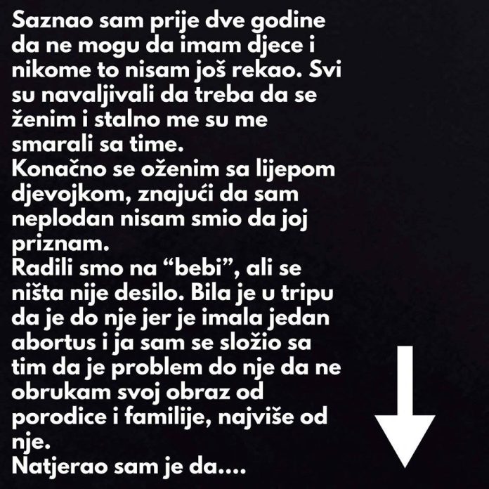 Konačno se oženim sa lijepom djevojkom, znajući da sam neplodan nisam smio da joj priznam.