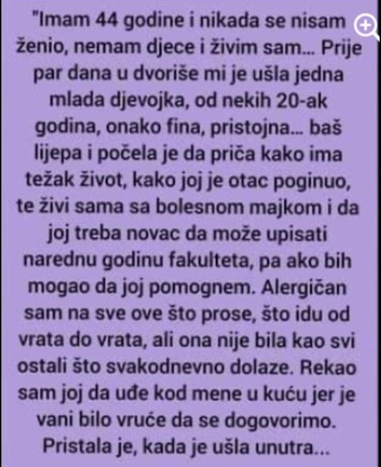 Prije par dana u dvoriše mi je ušla jedna mlada djevojka, od nekih 20-ak godina, onako fina, pristojna… baš lijepa i počela je da priča kako ima težak život, kako joj je otac poginuo, te živi sama sa bolesnom majkom i da joj treba novac da može upisati narednu godinu fakulteta, pa ako bih mogao da joj pomognem.