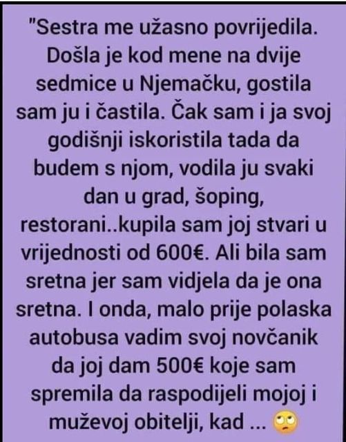“Sestra me užasno povrijedila. Došla je kod mene na dvije sedmice u Njemačku, gostila sam ju i častila.