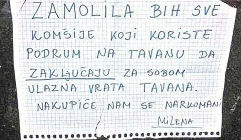 Presmiješno sročena molba, viđena u haustoru jedne zgrade negdje u susjedstvu, ovih dana nasmijala je tisuće u regiji. Morate vidjeti što brine stanarku Milenu!