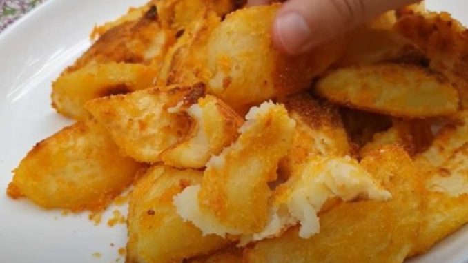 Krompir operite, oljuštite, isijecite na kriške i stavite na pleh sa papirom za pečenje. Začinite svim začinima iz recepta, prelijte uljem i sve dobro izmiješajte.