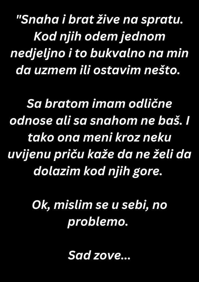 “Snaha i brat žive na spratu. Kod njih odem jednom nedjeljno i to bukvalno na min da uzmem ili ostavim nešto. Sa bratom imam odlične odnose ali sa snahom ne baš. I tako ona meni kroz neku uvijenu priču kaže da ne želi da dolazim kod njih gore. Ok, mislim se u sebi, no problemo.