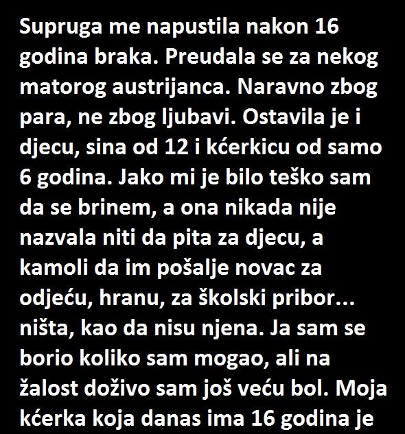 Ja sam se borio koliko sam mogao, ali na žalost doživio sam još veću bol. Moja kćerka koja danas ima 16 godina je… otišla. Rekla mi je da sam loš otac, grozan i otišla. Vjerovali ili ne , otišla je mami u Austriju. Kako sam saznao, taj njen je umro prije godinu dana i sada se sjetila djece.