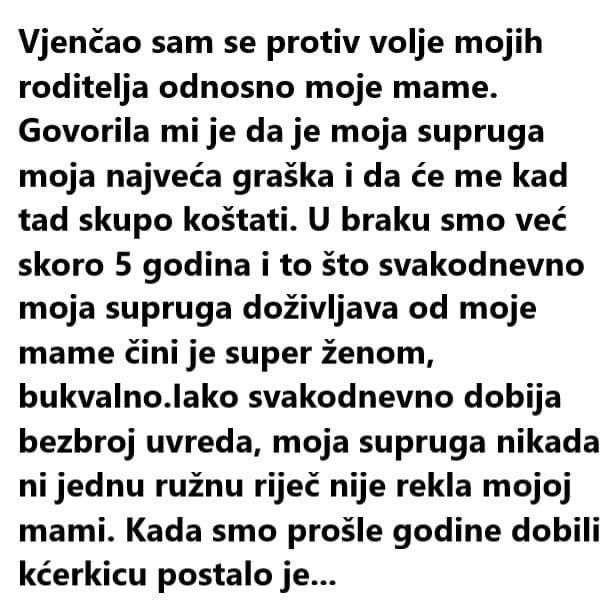 Vjenčao sam se protiv volje mojih roditelja odnosno moje mame. Govorila mi je da je moja supruga moja najveća graška i da će me kad tad skupo koštati. U braku smo već skoro 5 godina i to što svakodnevno moja supruga doživljava od moje mame čini je super ženom, bukvalno. Iako svakodnevno dobija bezbroj uvreda, moja supruga nikada ni jednu ružnu riječ nije rekla mojoj mami. Kada smo prošle godine dobili kćerkicu postalo je još gore, moja mama je ubjeđena da sam ja sterilan i da ne mogu imati djecu, te mi je govorila kako moja kćerka ne može biti moja. Iskren da budem koliko mi je puta mama sve to ponovila jednim dijelom sam počeo da sumnjam.