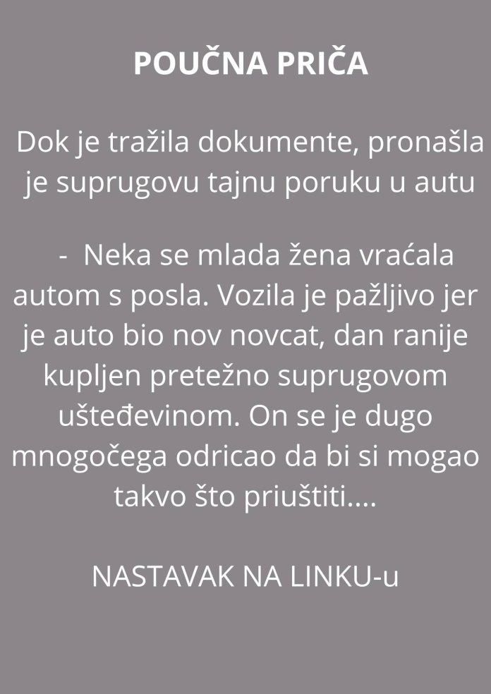 Pronašla je komad papira. Čvrstim muškim rukopisom na njemu je pisalo: „U slučaju prometne nesreće… sjeti se, dušo, ja volim tebe, a ne auto!“