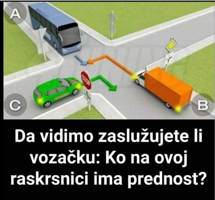 Kao što se može vidjeti na slici, na raskrsnici na kojoj nema semafora nalaze se kamion, automobil i autobus. Kamion treba da skrene lijevo, automobil desno dok autobus ide pravo.