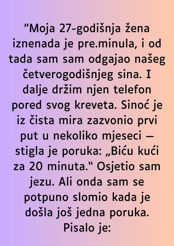 I dalje držim njen telefon pored svog kreveta. Sinoć je iz čista mira zazvonio prvi put u nekoliko mjeseci — stigla je poruka: „Biću kući za 20 minuta.“