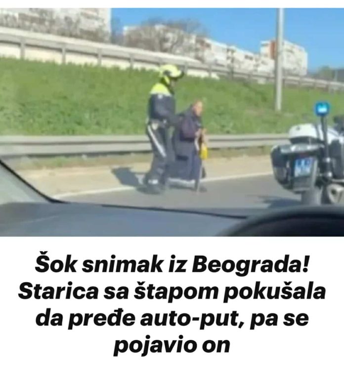 Nevjerovatan snimak zabilježen je danas u Beogradu, kada je jedna baka pokušala da pređe auto-put i to sa štapom u rukama. Na svu sreću, prisutni saobraćajni policajac je zaustavio saobraćaj i pomogao starijoj ženi da bez problema pređe put.