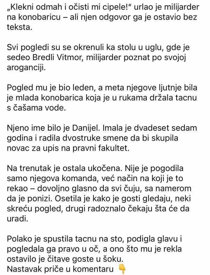 Bredli je trepnuo, kao da mu je trebalo vreme da obradi ono što je upravo čuo. Nije bio naviknut da mu iko protivreči. Njegova moć bila je njegov štit – a sada ju je jedna konobarica probila jednostavnom rečenicom. Menadžer je prišao i tiho mu šapnuo: „Gospodine Vitmor… molim vas…“ Ali Bredli je samo odmahnuo rukom, ne želeći da napravi veći skandal. Danijel je podigla tacnu i nastavila s poslom. Spolja je izgledala sabrano, ali unutra joj je krv ključala. Znala je da će ovo možda koštati posla, ali nije mogla da dozvoli da je neko tako ponizi. Vest se proširila brže nego što je mogla da zamisli. Jedan od gostiju te večeri napisao je objavu na društvenim mrežama: „Veče kada je konobarica naučila milijardera lekciju o dostojanstvu.“ Objava je postala viralna. Hiljade ljudi delilo je priču, komentarisalo, navodilo Danijel kao primer hrabrosti. Sutradan, dok je brisala stolove, primetila je promenu. Ljudi su je prepoznavali, smeškali joj se, ostavljali napojnice uz reči: „Bravo“ i „Svaka čast“. Ali ona je i dalje nosila nelagodu u grudima – jer je znala da moćni ljudi poput Vitmora ne zaboravljaju lako. Dva dana kasnije, u restoran je ušao čovek u skupom odelu, stroga držanja. Prišao joj je i rekao tihim glasom: „Gospodin Vitmor želi da vas vidi.“