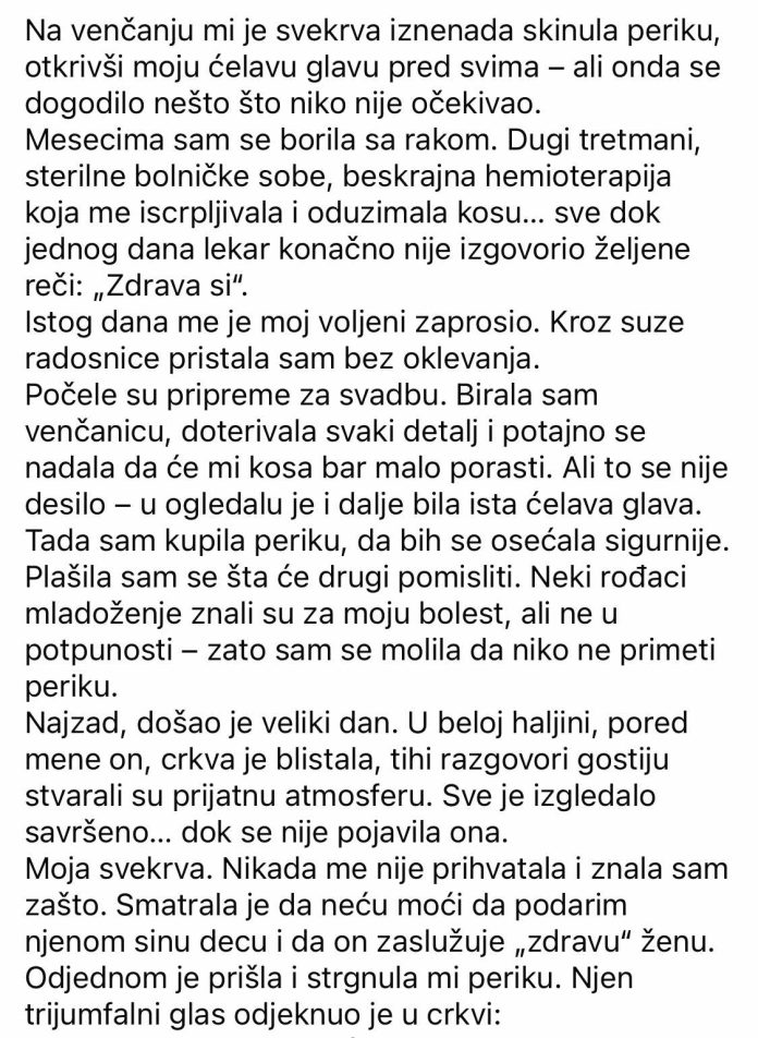 Na svadbi mi je svekrva iznenada skinula periku i svi su ugledali moju golu glavu. Ukopala sam se na mestu, očekujući podsmeh i osudu, ali desilo se nešto što niko nije očekivao.
