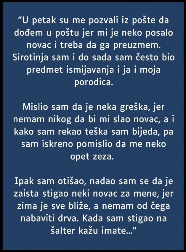 U petak su me pozvali iz pošte da dođem u poštu jer mi je neko posalo novac i treba da ga preuzmem. Sirotinja sam i do sda sam često bio predmet ismijavanja i ja i moja porodica. Mislio sam da je neka greška, jer nemam nikog da bi mi slao novac, a i kako sam rekao teška sam bijeda, pa sam iskreno pomislio da me neko opet zeza. Ipak sam otišao, nadao sam se da je zaista stigao neki novac za mene, jer zima je sve bliže, a nemam od čega nabaviti drva. Kada sam stigao na šaket kažu imate pismo i 3000 dolara, i dalje nisam mogao da vjeruje.
