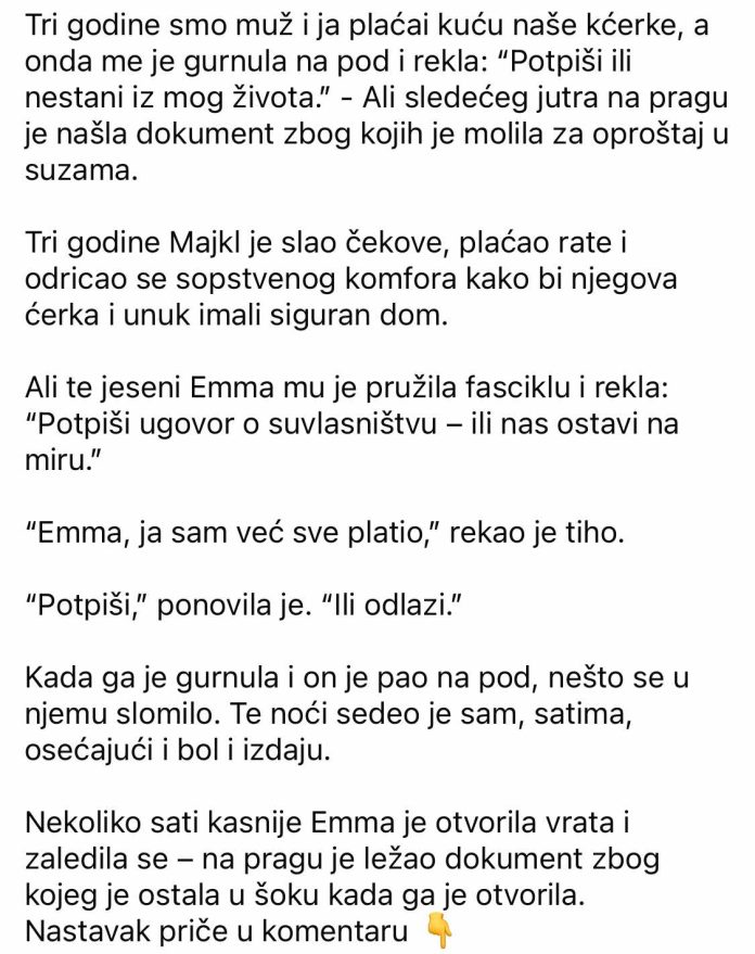 Ali te jeseni Emma mu je pružila fasciklu i rekla: “Potpiši ugovor o suvlasništvu – ili nas ostavi na miru.” “Emma, ja sam već sve platio,” rekao je tiho.