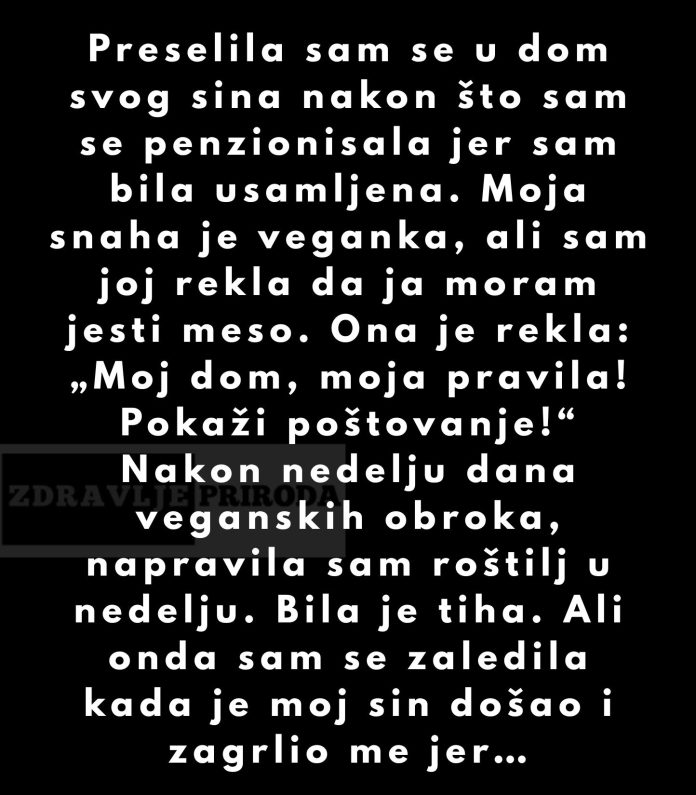 Problem je što je moja snaha veganka, a ja sam joj rekla da mi treba meso i da ga volim kao dio svoje dnevne ishrane. Ona je odgovorila: „Moj dom, moja pravila! Pokaži malo poštovanja!“