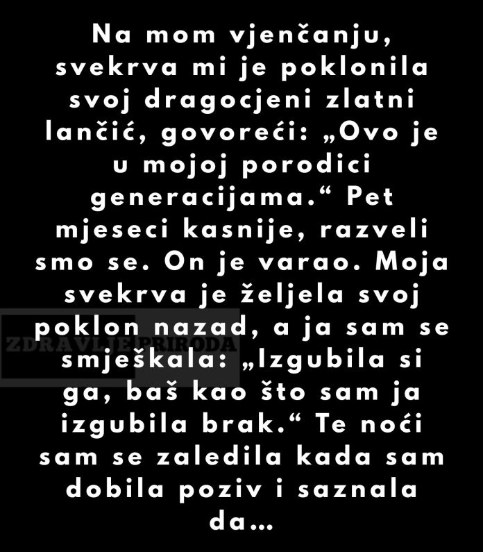 Na dan mog vjenčanja, svekrva mi je poklonila svoj dragocjeni zlatni lančić, govoreći: „Ovo je u mojoj porodici generacijama. Uzmi ga, i jednog dana želim da ga moja unuka naslijedi.“