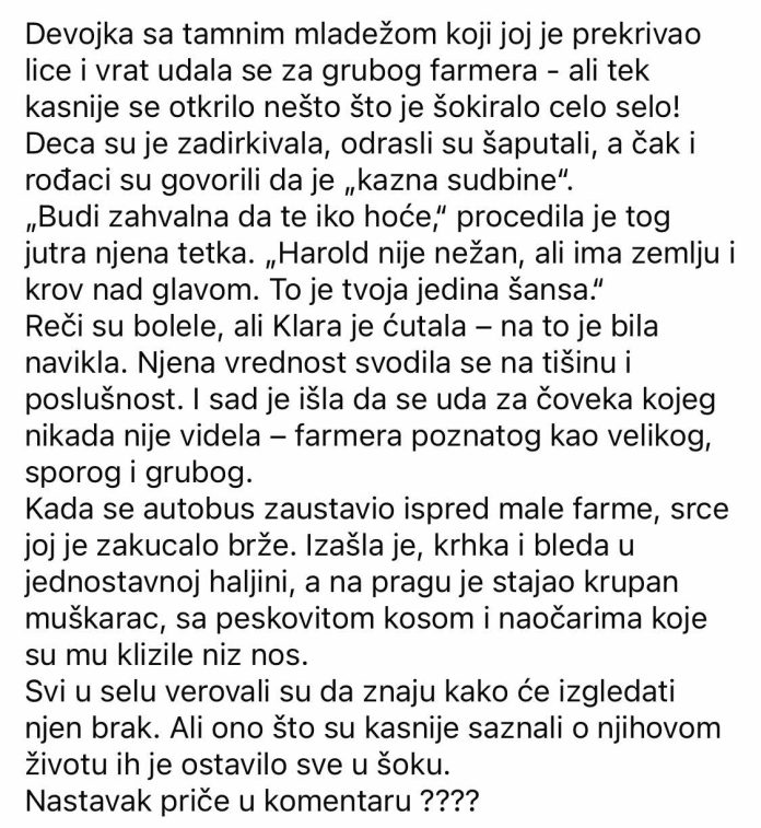 Na pijaci su i dalje šaptali iza njihovih leđa, ali Klara se više nije tresla pod njihovim pogledima. Stajala je pored Harolda, a kada bi neko dobacio ružnu primjedbu, on bi se uspravio i mirno rekao: „Moja žena je ljepša od bilo čijeg tuđeg mišljenja.“ Ljudi bi ušutjeli, a Klara je osjećala toplinu i sigurnost koju nikada ranije nije poznavala.