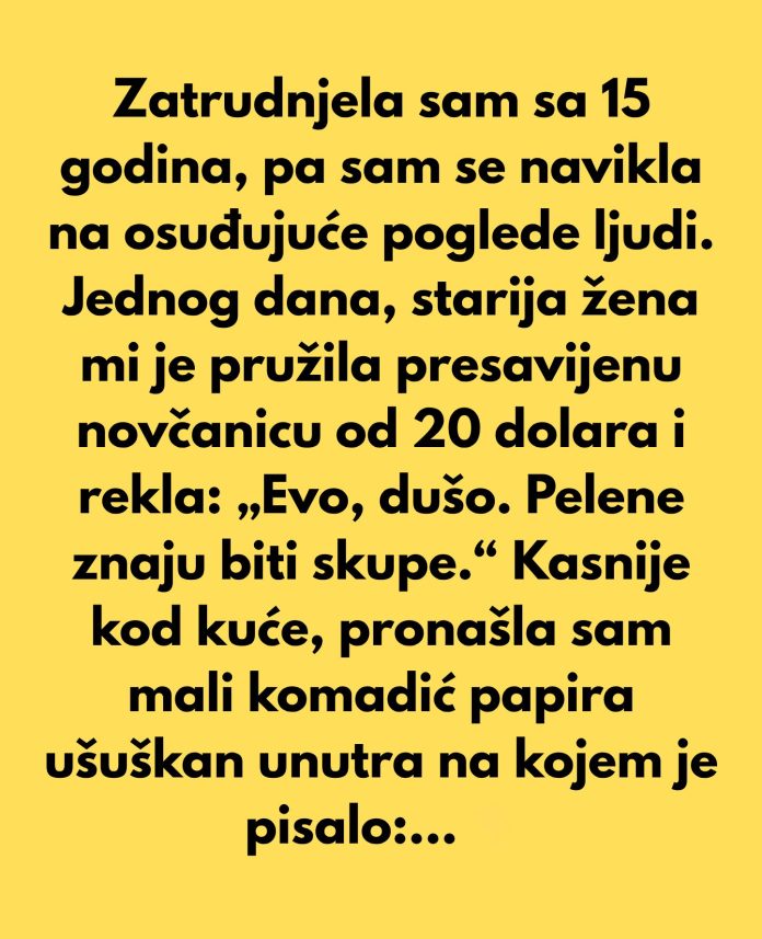 Zatrudnjela sam sa 15 godina, pa sam se navikla na osuđujuće poglede ljudi. Jednog dana, starija žena mi je pružila presavijenu novčanicu od 20 dolara i rekla: „Evo, dušo. Pelene znaju biti skupe.“ Kasnije kod kuće pronašla sam mali komadić papira ušuškan unutra na kojem je pisalo: „Jača si nego što misliš.“ Godinama kasnije otkrila sam jedva vidljiv natpis na poleđini — moje ime. Nikada prije nisam srela tu ženu. Jednog dana, dok sam posjećivala mamu, spomenula sam joj poruku — i ona je utihnula. Zatim se nasmiješila i rekla: „Bila je to susjeda kojoj sam jednom pomogla kad niko drugi nije htio. Izgleda da je zapamtila.“