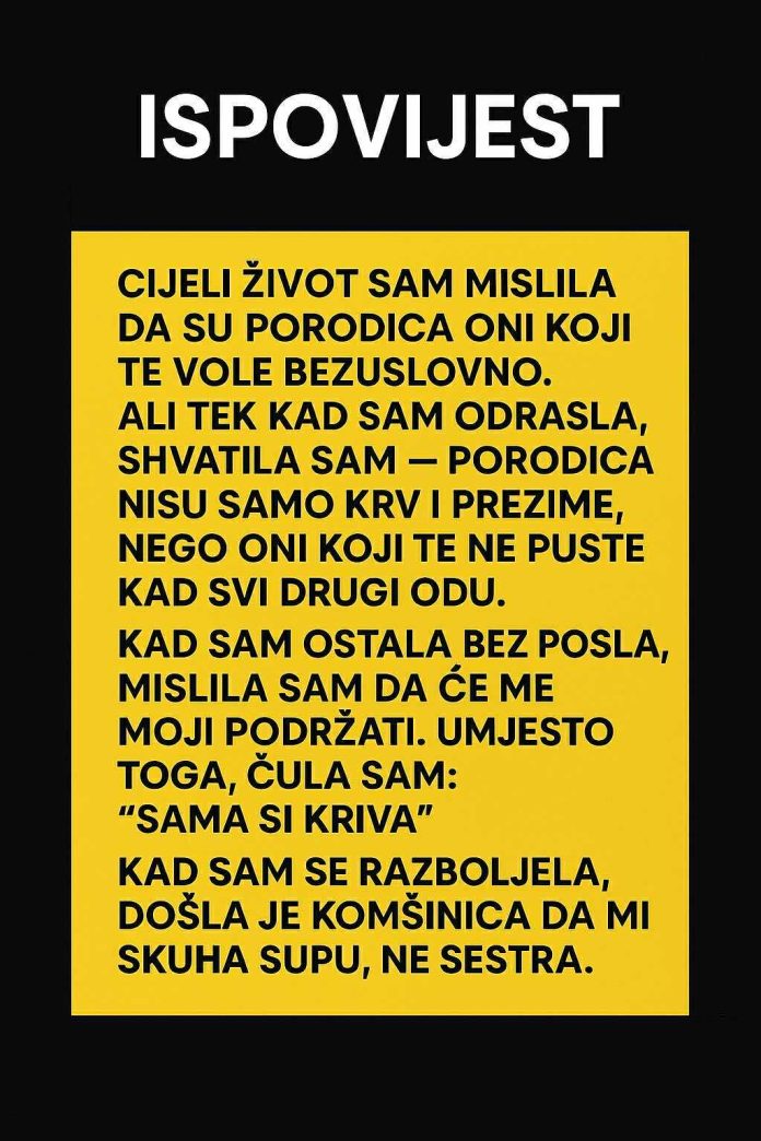 Ali tek kad sam odrasla, shvatila sam — porodica nisu samo krv i prezime, nego oni koji te ne puste kad svi drugi odu.
