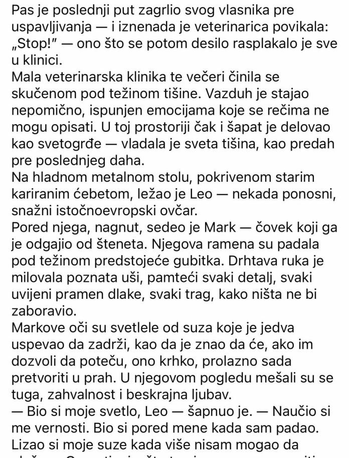 I odjednom se desilo nešto neočekivano. Skupivši poslednju snagu, Leo je podigao šape i zagrlio Marka oko vrata. Njegovi slabi, drhtavi pokreti bili su ispunjeni snagom ljubavi. To je bilo i oproštaj i izraz zahvalnosti: „Hvala ti što si bio uz mene. Hvala ti za dom. Hvala ti što si moj čovek.“