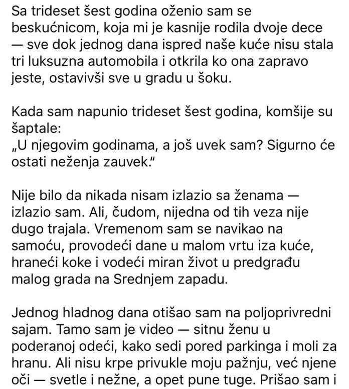 Imao sam 36 godina kada sam se oženio beskućnicom. Nekoliko godina nakon braka i rođenja dvoje dece, ispred naše kuće su se zaustavila tri luksuzna automobila — i tek tada se otkrilo ko je ona zapravo bila.