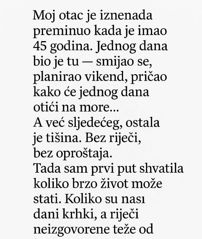 Jednog dana bio je tu — smijao se, planirao vikend, pričao kako će jednog dana otići na more…