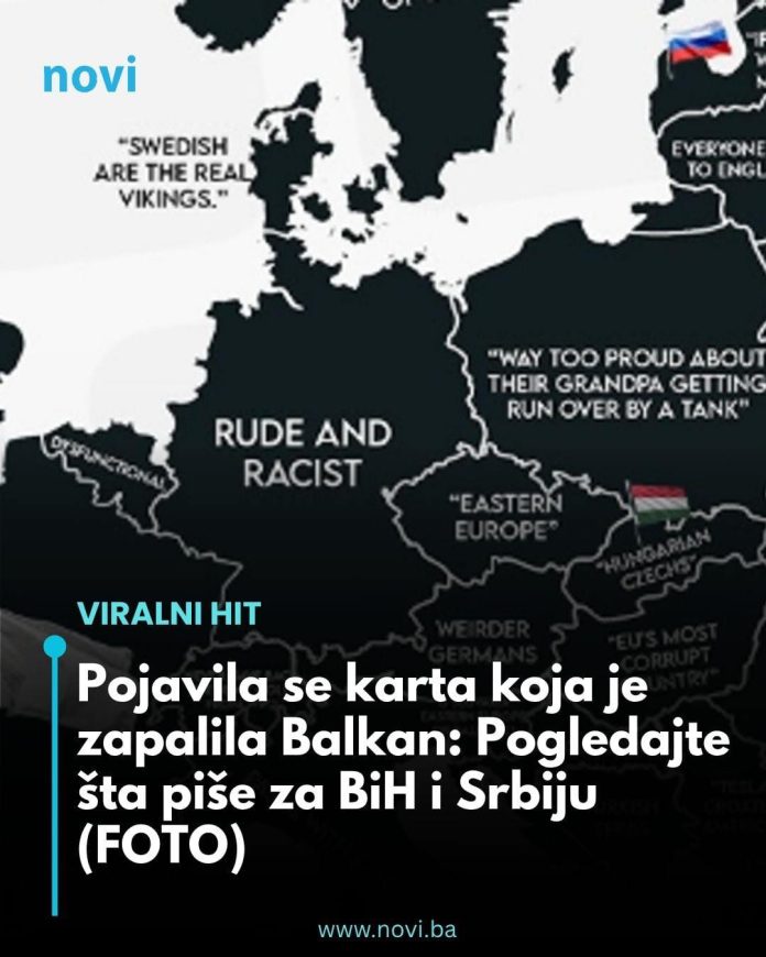 Na karti pod naslovom „Kako uvrijediti Evropljane u jednoj rečenici“, svaka država dobila je svoj „opis“ zasnovan na stereotipima, istorijskim nesuglasicama i nacionalnim osjetljivostima. Za Hrvatsku je navedeno: „Katolički Srbi“, što je, očekivano, izazvalo niz reakcija. Za Srbiju piše: „Tesla je hrvatski Amerikanac“, dok je za Bosnu i Hercegovinu navedeno: „Turski Srbi“.