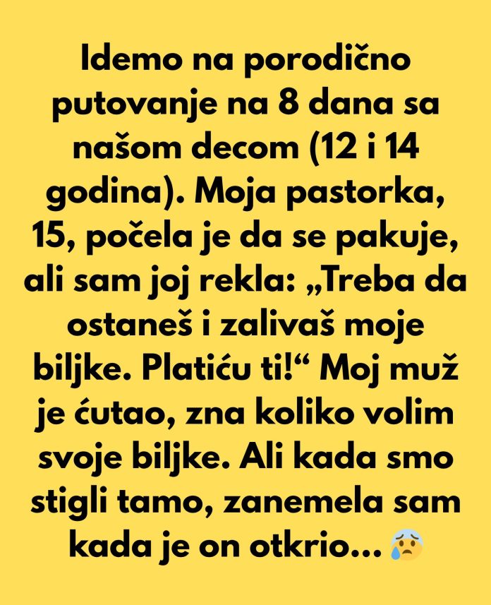 Idemo na porodično putovanje u Španiju na 8 dana sa naše dvoje dece (12 i 14 godina). Moja pastorka, koja ima 15 godina, počela je da se pakuje, ali sam joj rekla: „Treba da ostaneš da zalivaš moje biljke. Platiću ti!“