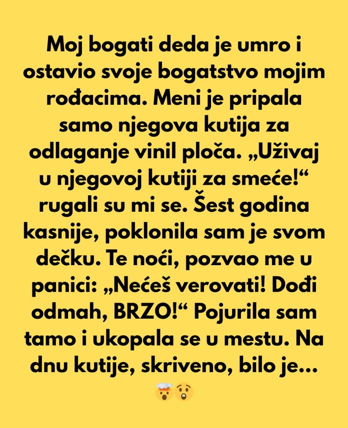 Moj bogati deda je preminuo i celokupno svoje bogatstvo ostavio mojim rođacima. Meni je pripala samo njegova stara kutija za čuvanje vinil ploča. „Uživaj u njegovoj kutiji za đubre!“ rugali su mi se.