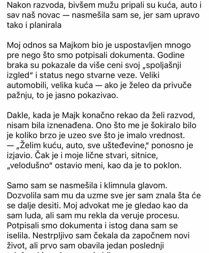 Bivši muž je nakon razvoda dobio kuću, automobil i sav novac, ali ona se smeškala — jer je upravo tako to isplanirala.