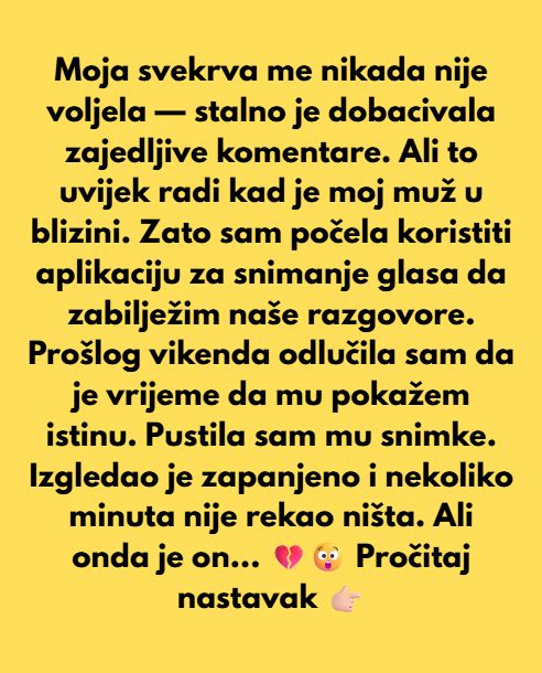 Prošli vikend, nakon što je Jane otišla iz naše kuće na još jednu posjetu, odlučila sam da je vrijeme da mu pokažem istinu. Pustila sam mu snimke. Bio je šokiran i nekoliko minuta nije ništa rekao. Zatim je rekao da ne može vjerovati da bi njegova mama rekla takve stvari.