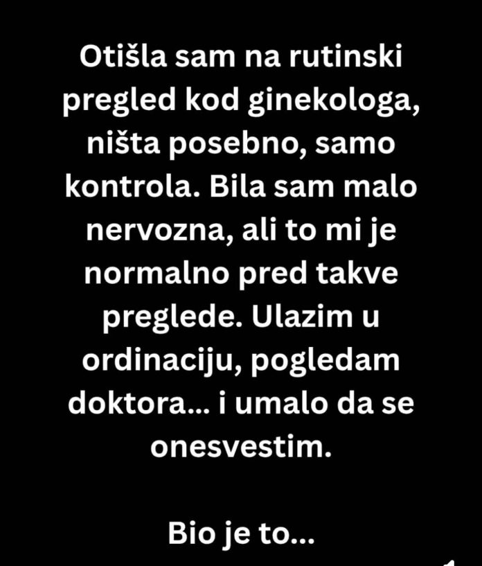Otišla sam na rutinski pregled kod ginekologa, ništa posebno, samo kontrola. Bila sam malo nervozna, ali to mi je normalno pred takve preglede. Ulazim u ordinaciju, pogledam doktora… i umalo da se onesvestim.