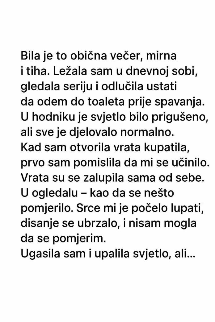 Bila je to obična večer, mirna i tiha. Ležala sam u dnevnoj sobi, gledala seriju i odlučila ustati da odem do toaleta prije spavanja.