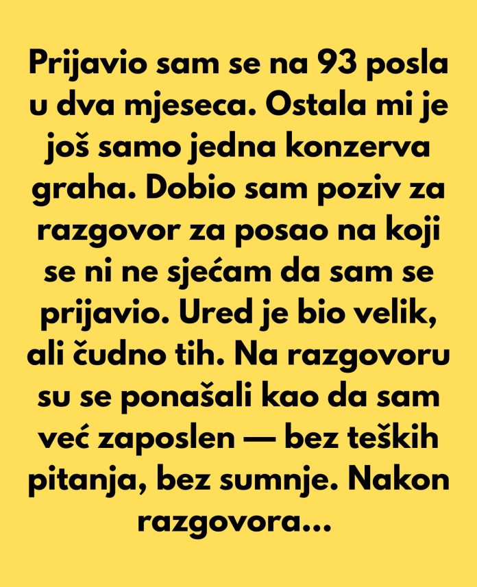 Prijavio sam se na 93 posla u dva mjeseca. Ostala mi je još samo jedna konzerva graha. Dobio sam poziv za razgovor za posao na koji se ni ne sjećam da sam se prijavio.