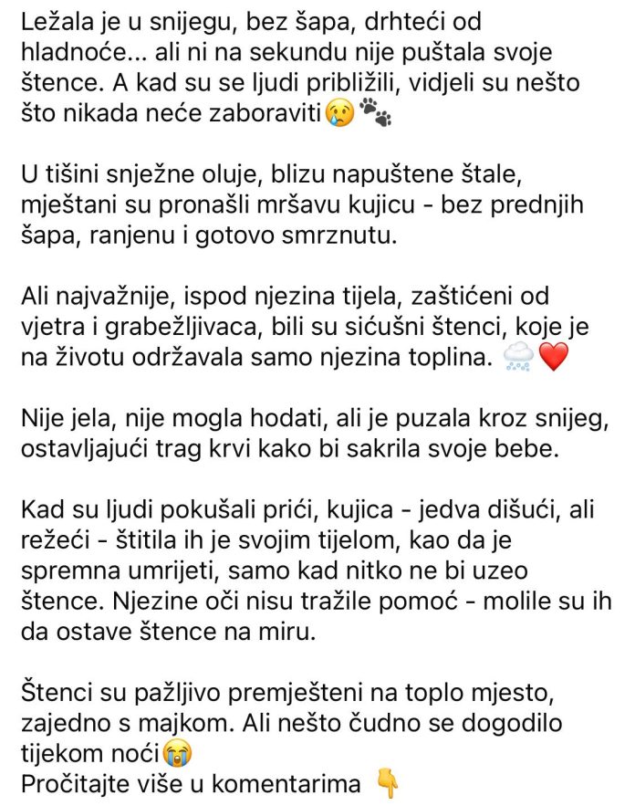Kuca – mršava, s upalim očima, bez prednjih šapa. Tijelo joj je bilo gotovo nevidljivo zbog snijega. Drhtala je, ali se nije pomicala – samo je teško disala, prekrivajući nešto malo, jedva čujno, cviljenje.