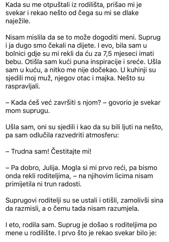 I eto, rodila sam. Suprug je došao s roditeljima po mene u rodilište. I prvo što je rekao svekar bilo je: