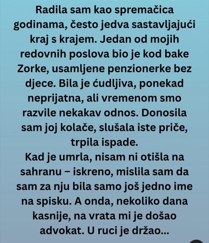 Kad je preminula, saznala sam iz vijesti. Nisam bila ni pozvana na sahranu. Pomislila sam – eto, još jedno poglavlje zatvoreno. U utorak sam išla na drugi posao kada mi je zazvonio telefon. Nepoznat broj. Na drugoj strani – advokat. Pitao me da li mogu da dođem na kratki razgovor u vezi sa imovinom gospođe Zorke.
