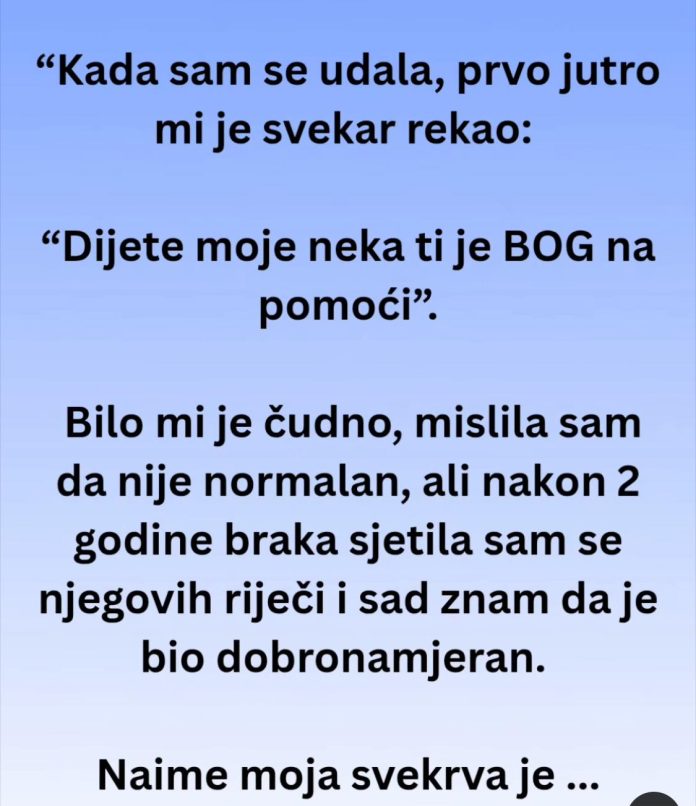 “Kada sam se udala, prvo jutro mi je svekar rekao: “Dijete moje neka ti je BOG na pomoći”. Bilo mi je čudno, mislila sam da nije normalan, ali nakon 2 godine braka sjetila sam se njegovih riječi i sad znam da je bio dobronamjeran. Naime moja svekrva je toliko zla osoba, da je on najbolje znao kakva je jer je sa njom proveo desetine godina.