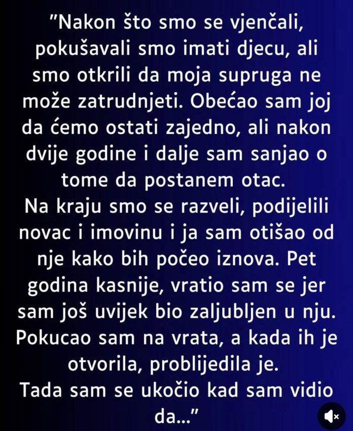 Pet godina kasnije, vratio sam se jer sam još uvijek bio zaljubljen u nju. Pokucao sam na vrata, a kada ih je otvorila, problijedila je.