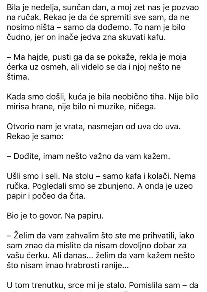 Bila je nedelja, sunčan dan, a moj zet nas je pozvao na ručak. Rekao je da će spremiti sve sam, da ne nosimo ništa – samo da dođemo. To nam je bilo čudno, jer on inače jedva zna skuvati kafu.
