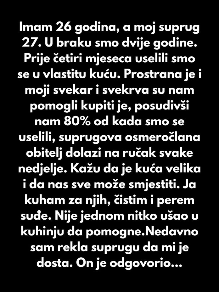 No od kada smo se uselili, suprugova osmeročlana obitelj dolazi na ručak svake nedjelje. Kažu da je kuća velika i da nas sve može smjestiti. Ja kuham za njih, čistim i perem suđe. Nije jednom nitko ušao u kuhinju da pomogne.