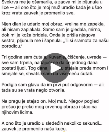 Zvuk šamara odjeknuo je kućom kao pucanj. Obraz mi je gorio, oči zasuzile, ali nisam pustila suzu. Nisam im htjela dati to zadovoljstvo.Prije nego što sam se uspravila, zaova je već bila na meni – pljunula mi pred noge i zlobno se nasmijala. „Patetična si,“ prosiktala je, kao da joj je ta uvreda donijela zadovoljstvo.